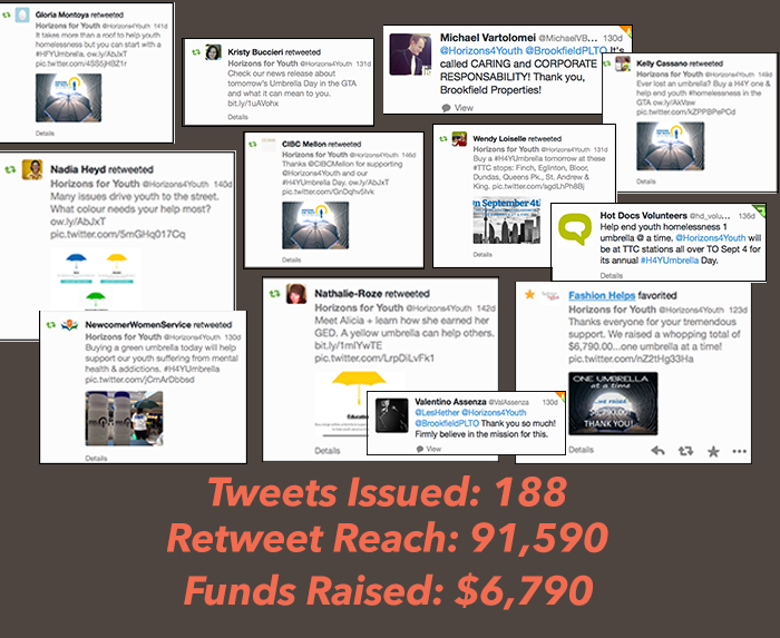 Using the hashtag #H4YUmbrella, I developed an Excel editorial calendar to schedule two to seven tweets per day (depending on the day of the week) and one Facebook post per day for the month leading up to Umbrella Day. To optimize engagement, I allocated an image or URL to each tweet and an image to each Facebook post. Content for the tweets/posts: promoted the date, event and locations; communicated and quizzed the community about the meaning of each umbrella colour; provided thank-you callouts to in-kind and monetary sponsors; and provided HFY/youth homeless stories and stats, using campaign relevant words like shelter, open, umbrella and rain.